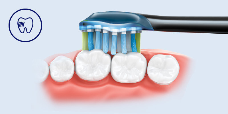 Końcówka C3 Premium Plaque Defence dostosowuje się do kształtu zębów i dziąseł dzięki zastosowaniu elastycznych elementów bocznych, które zwiększają powierzchnię kontaktu z zębami 4-krotnie w stosunku do zwykłej końcówki szczoteczki**, umożliwiając głębokie oczyszczanie.