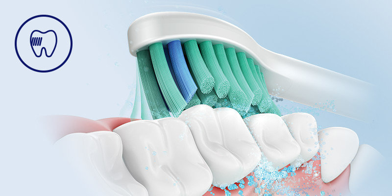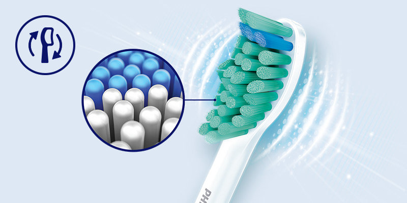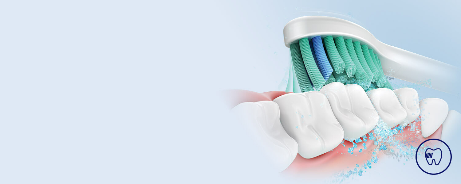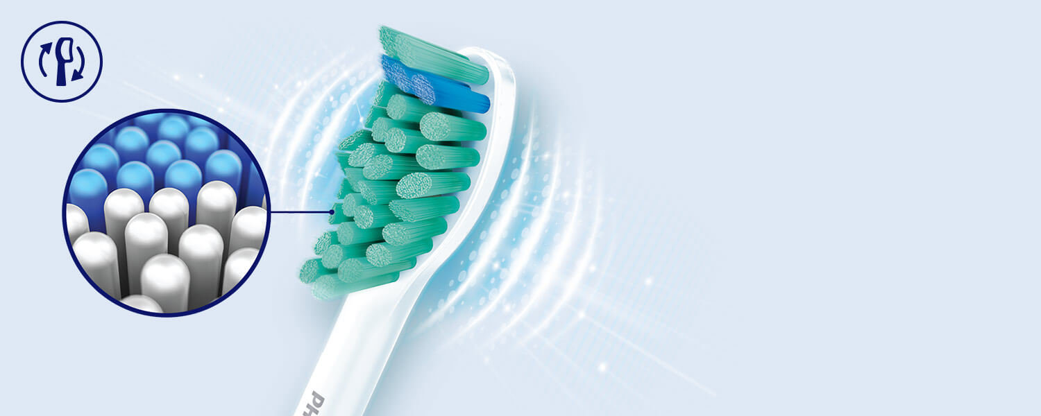 Aż 62 tys. ruchów na minutę nadaje dużą prędkość mieszaninie płynu (pasty i śliny) wytwarzając mikrobąbelki, a następnie szeroki zakres ruchu włosia oryginalnych końcówek Philips Sonicare wtłacza je głęboko w przestrzenie międzyzębowe zapewniając doskonałe czyszczenie.
