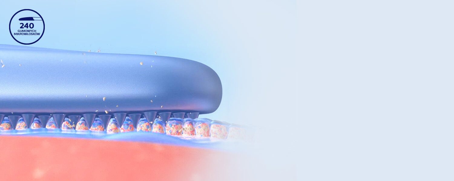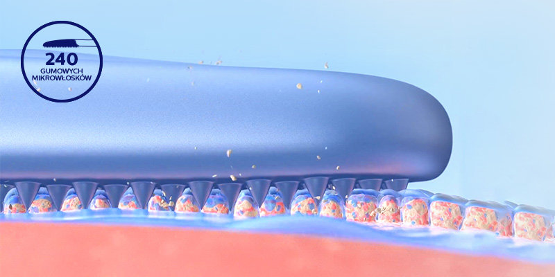 240 gumowych mikrowłosków skutecznie czyści miękką i porowatą powierzchnię języka. Mikrowłoski dopasowują się i delikatnie oczyszczają nierówności, aby usunąć nagromadzone bakterie. Kompaktowa konstrukcja końcówki pozwala wygodnie oczyścić cały język.