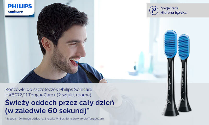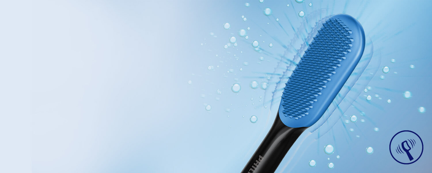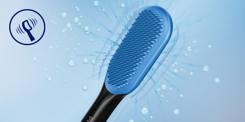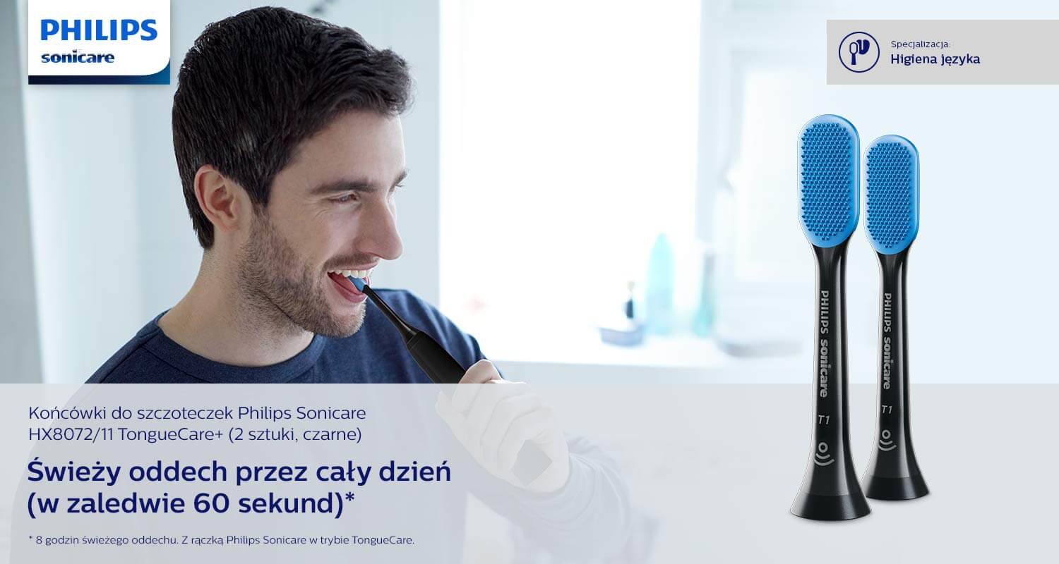 TongueCare+ jest jedynym przyrządem do czyszczenia języka o mocy Philips Sonicare, dzięki czemu przy każdym ruchu szczoteczki usuwa powodujące nieprzyjemny zapach bakterie. 62 tys. ruchów na minutę rozbija resztki na języku, usuwa powodujące nieprzyjemny zapach bakterie. Język będzie czystszy, a oddech dłużej świeży.