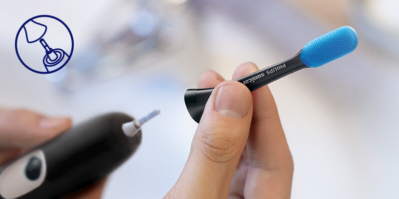 Końcówka TongueCare+ pasuje do wszystkich rączek szczoteczek Philips Sonicare. Mocowanie na kliknięcie ułatwia zakładanie końcówki szczoteczki.