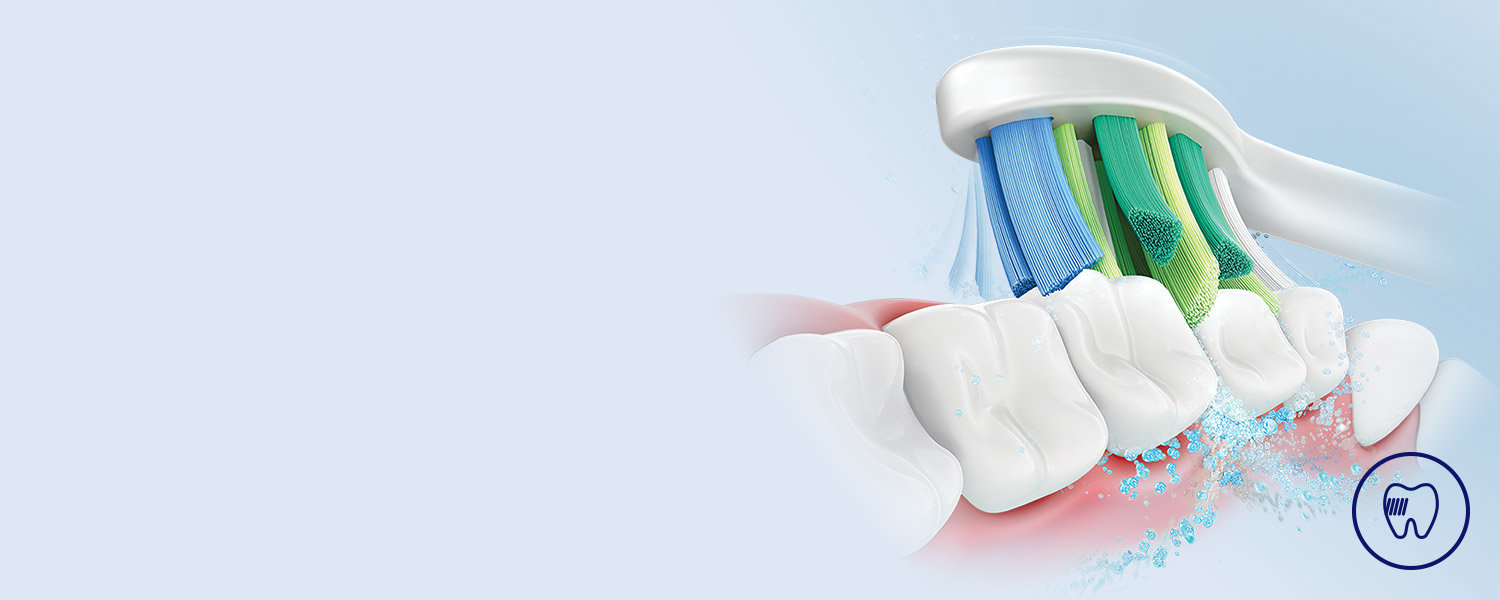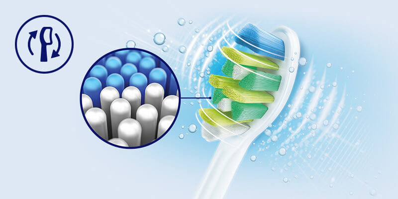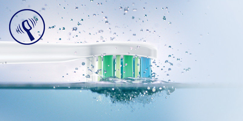 Aż 62 tys ruchów na minutę nadaje dużą prędkość mieszaninie płynu (pasty i śliny) wytwarzając mikrobąbelki, a następnie szeroki zakres ruchu włosia oryginalnych końcówek Philips Sonicare wtłacza je głęboko w przestrzenie międzyzębowe zapewniając doskonałe czyszczenie.