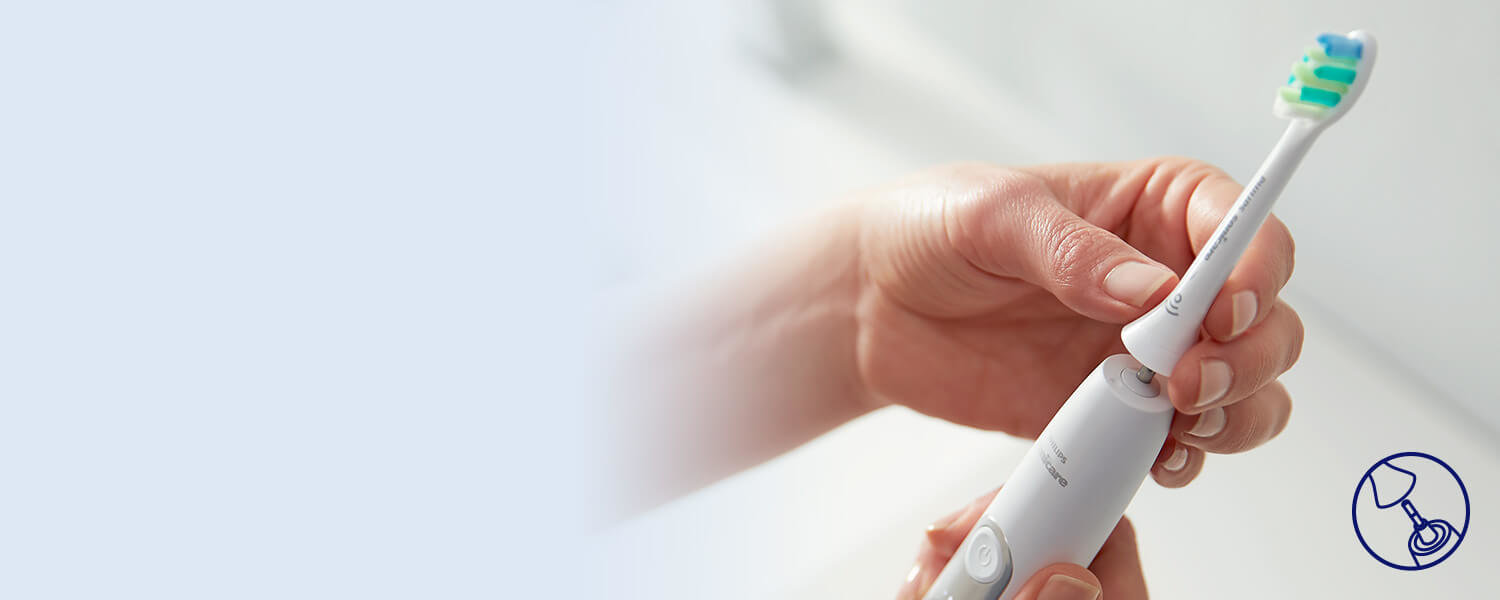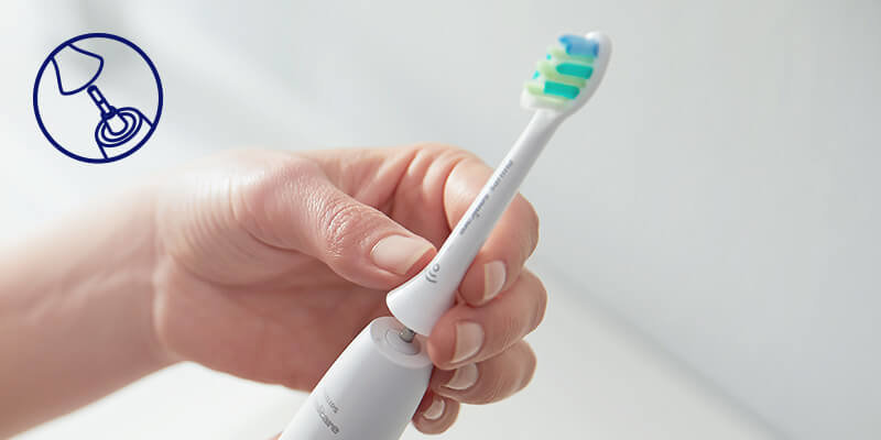 Końcówka InterCare pasuje do wszystkich rączek szczoteczek Philips Sonicare. Mocowanie na kliknięcie ułatwia zakładanie końcówki szczoteczki.