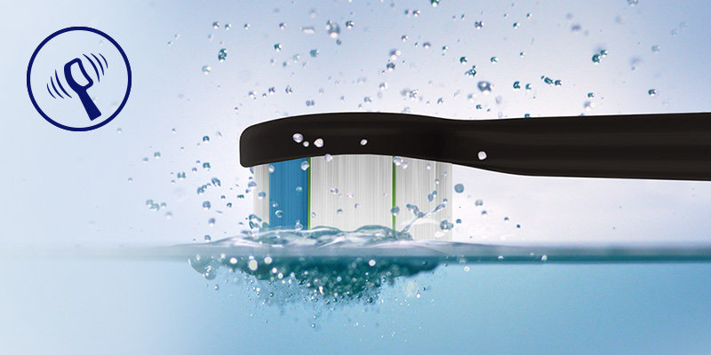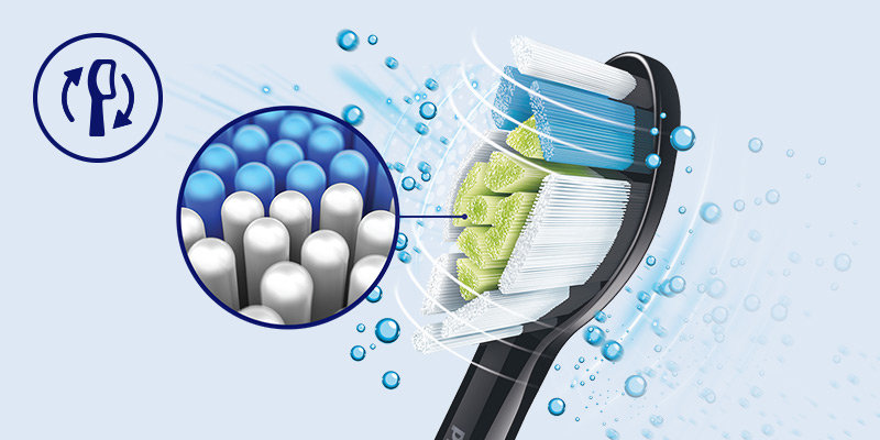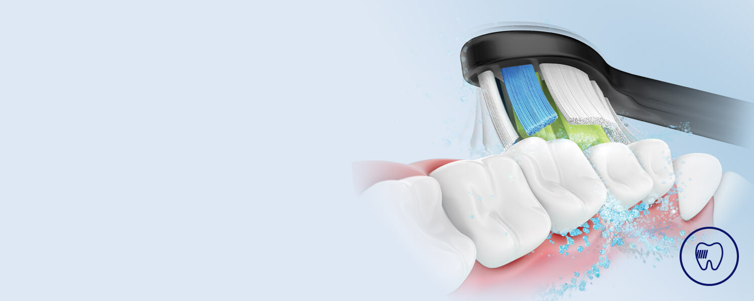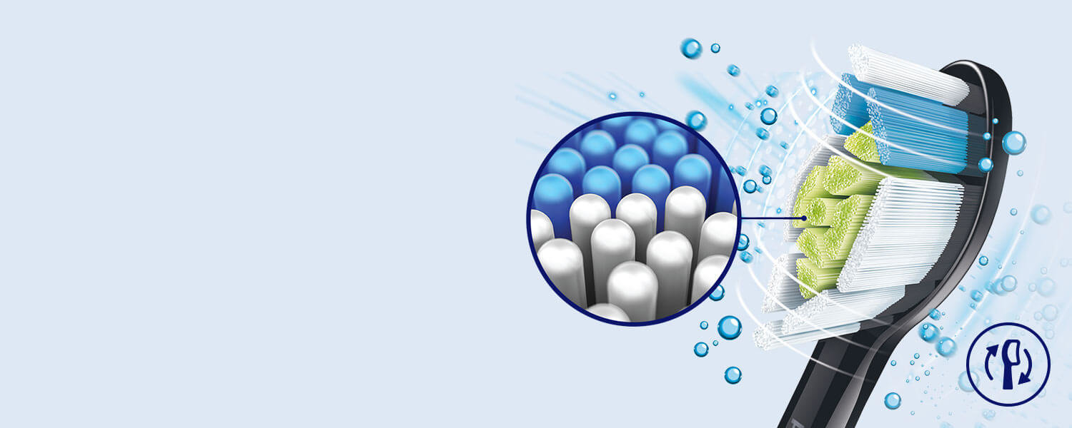 Aż 62 tys ruchów na minutę nadaje dużą prędkość mieszaninie płynu (pasty i śliny) wytwarzając mikrobąbelki, a następnie szeroki zakres ruchu włosia oryginalnych końcówek Philips Sonicare wtłacza je głęboko w przestrzenie międzyzębowe zapewniając doskonałe czyszczenie.