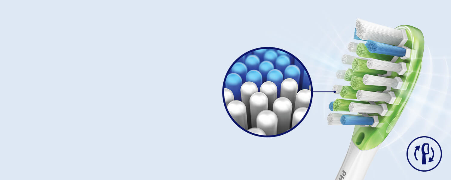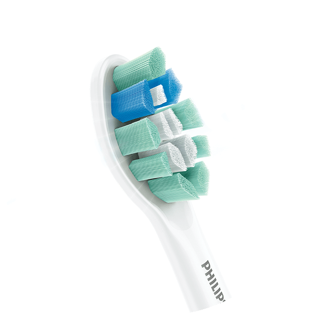 Gęste włosie na środku końcówki szczoteczki W3 Philips Sonicare Premium White usuwa płytkę nazębną i spowodowane przez jedzenie i napoje powierzchniowe przebarwienia z zębów. Elastyczne elementy boczne dopasowują się do kształtu zębów i dziąseł, aby zapewnić dokładniejsze czyszczenie i jaśniejszy uśmiech zaledwie w ciągu 3 dni.
