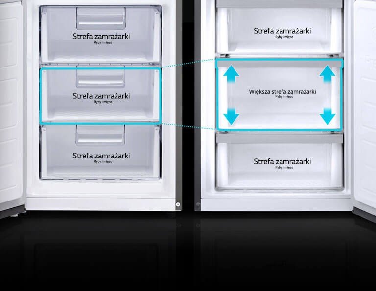 Firma LG powiększyła jedną z szuflad zamrażarki, aby zapewnić więcej miejsca na przechowywanie dużych produktów.