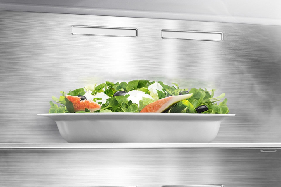 Chłodne powietrze, wydmuchiwane na wielu poziomach, jest równomiernie rozprowadzane wewnątrz lodówki. Utrzymywana jest stała temperatura, a żywność zachowuje na dłużej wartości odżywcze i smak.