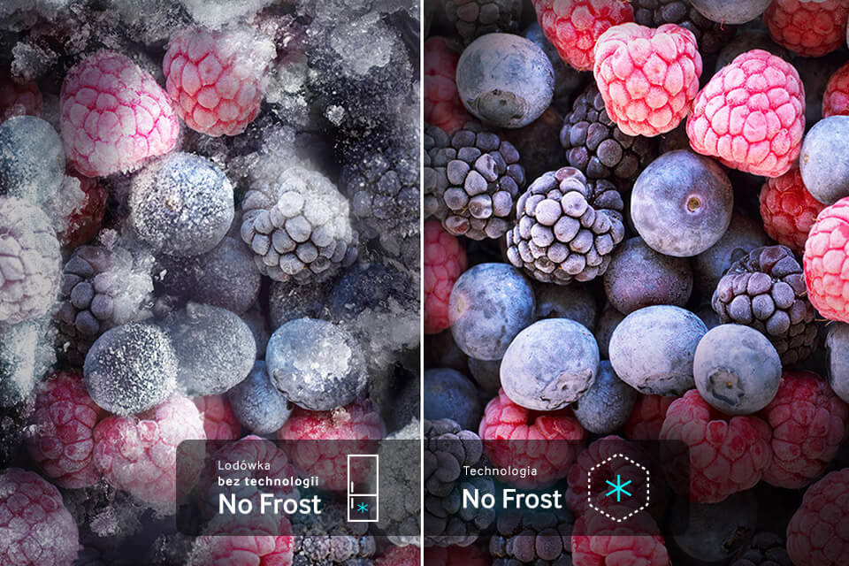 Technologia eliminuje tworzenie się szronu i lodu wewnątrz lodówki, dzięki czemu żywność pozostaje dłużej świeża i zachowuje więcej wartości odżywczych.