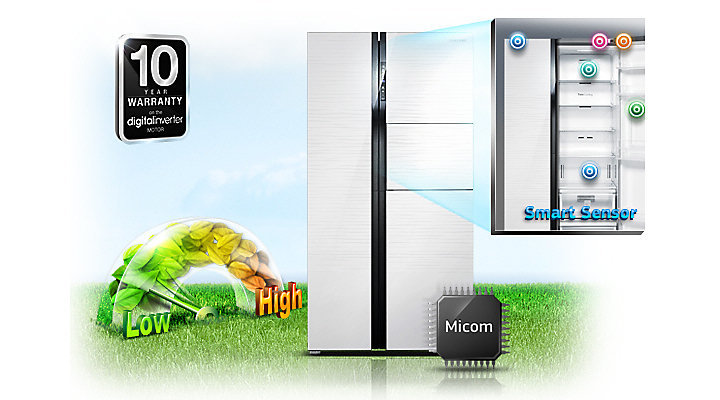 | Lodówka, która obniży Twoje rachunki za prąd Innowacyjny kompresor Digital Inverter oszczędza energię. Dziewięć czujników śledzi zmienne, takie jak wewnętrzna i zewnętrzna temperatura, poziom wilgotności oraz schematy korzystania z lodówki. Dzięki tym statystykom możliwe jest zoptymalizowanie parametrów tak, by utrzymać stałą temperaturę bez konieczności zatrzymywania i wznawiania pracy urządzenia. W rezultacie Digital Inverter zużywa 24% mniej energii niż tradycyjne kompresory. |