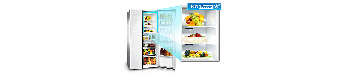 | Świeżość bez szronu Nie musisz już opróżniać lodówki i zamrażarki, żeby je rozmrozić. Technologia Samsung No Frost zapewnia równomierne chłodzenie, co zapobiega odkładaniu się szronu i lodu. Możesz przechowywać ulubioną żywność bez obaw, że zbliża się czas rozmrażania. Co więcej, utrzymywanie stałej temperatury przekłada się także na mniejsze zapotrzebowanie na energię i dłuższą sprawność systemu chłodzenia. |