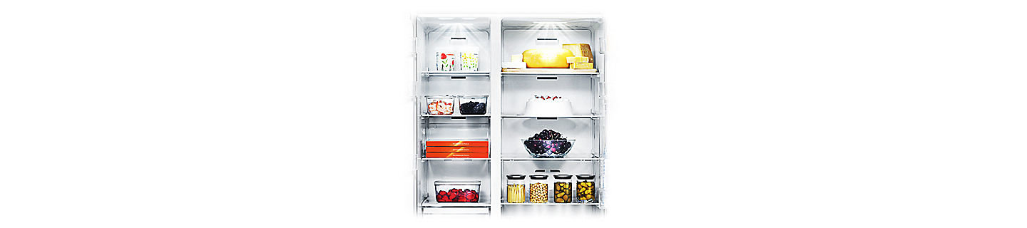 Jaśniejszy sposób na oszczędność energii Stylowa listwa oświetlenia LED rzuca światło na każdy kąt wnętrza lodówki. Łatwiej odnajdziesz to, czego szukasz, a to oznacza, że drzwi lodówki czy zamrażarki będą krócej otwarte. Ponadto mniejsze wymiary systemu oświetlenia to więcej miejsca na żywność. Diody LED nie emitują także ciepła oraz zużywają znacznie mniej energii niż tradycyjne żarówki. |