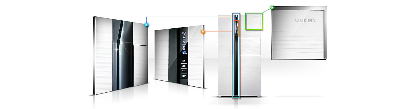 | Wzornictwo klasy premium dla nowoczesnej kuchni Nowa lodówka RS554 udowadnia, że prawdziwe piękno niekiedy leży w tym, czego nie widać. Schowana we wnęce rączka oraz ukryte zawiasy to dotyk minimalistycznej elegancji, który znakomicie uzupełni nowoczesne wnętrze. Jest na czym zawiesić oko – od wyszukanych wzorów (dostępnych w kolorach Shiny River White oraz EZ Clean Steel) aż po niebieski wyświetlacz LED. |