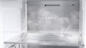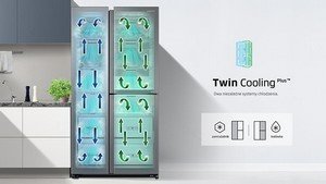 | Soczysta żywność - Twin Cooling Plus™ Żywność pozostaje soczysta i świeża dwa razy dłużej. Technologia Twin Cooling Plus™ optymalizuje temperaturę i wilgotność w lodówce oraz zamrażarce. Dzięki niezależnym obiegom powietrza zapachy nie mieszają się a żywność zachowuje swój naturalny aromat. |