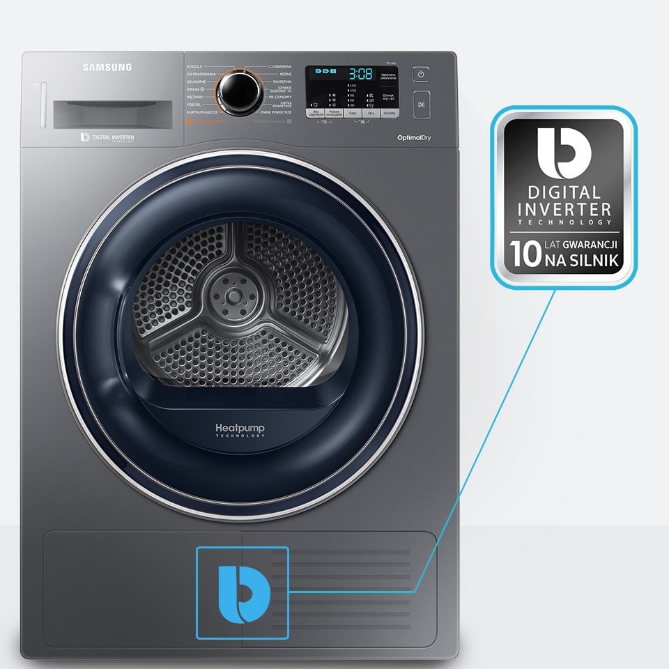 | Funkcje: | Silnik inwerterowy, Wyświetlacz elektroniczny, Możliwość montażu na pralce, System suszenia pompą ciepła |