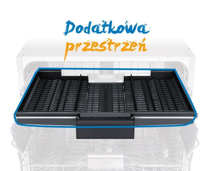 | Szeroki Trzeci Kosz Dzięki szerokiemu trzeciemu koszowi zwiększyliśmy pojemność zmywarki. Teraz z łatwością zmieścisz w zmywarce wszystkie – mniejsze i większe – sztućce i akcesoria kuchenne takie jak trzepaczki, łyżki wazowe i noże, bez konieczności ręcznego domywania ich. |