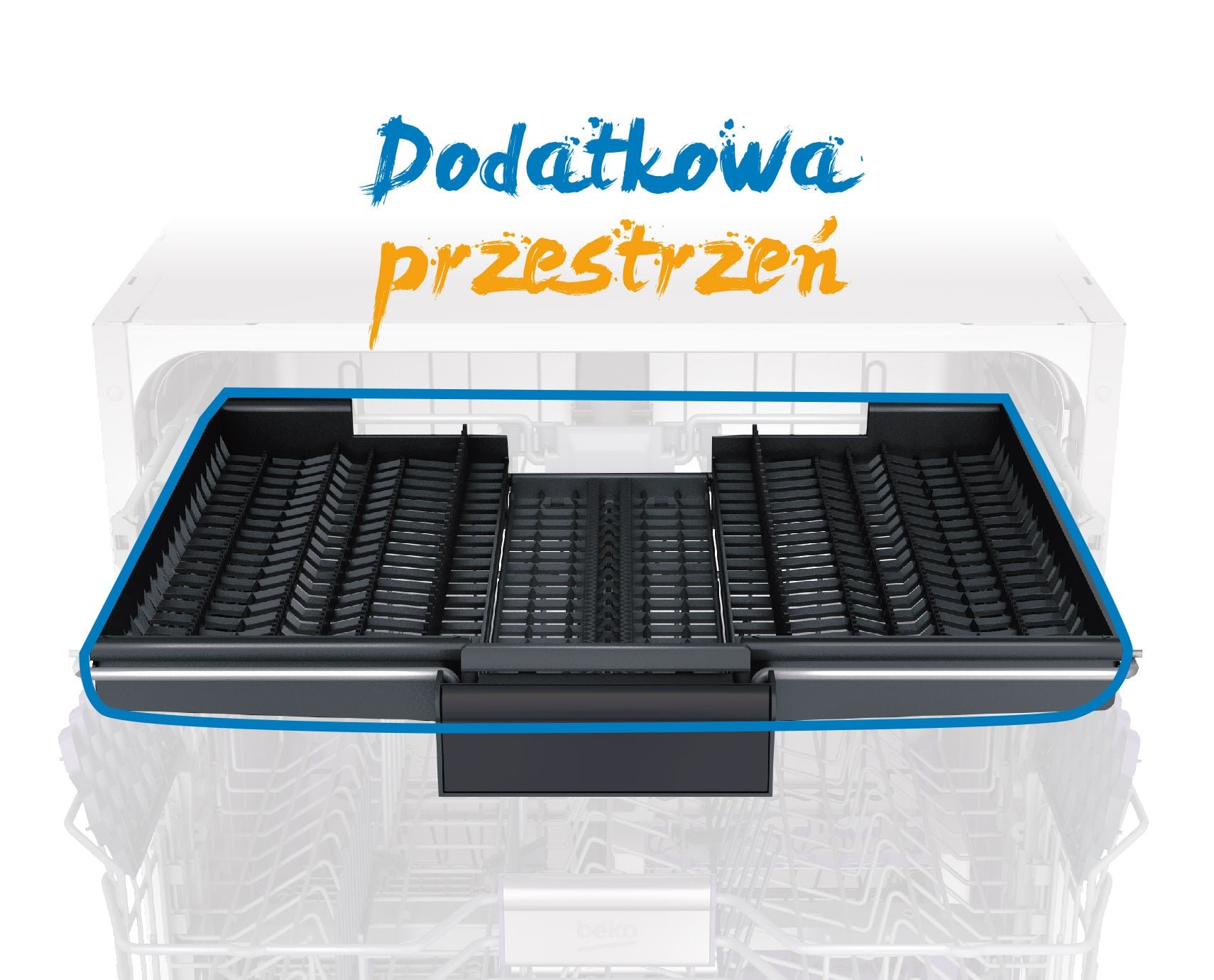 Szeroki Trzeci Kosz Dzięki szerokiemu trzeciemu koszowi zwiększyliśmy pojemność zmywarki. Teraz z łatwością zmieścisz w zmywarce wszystkie – mniejsze i większe – sztućce i akcesoria kuchenne takie jak trzepaczki, łyżki wazowe i noże, bez konieczności ręcznego domywania ich. |