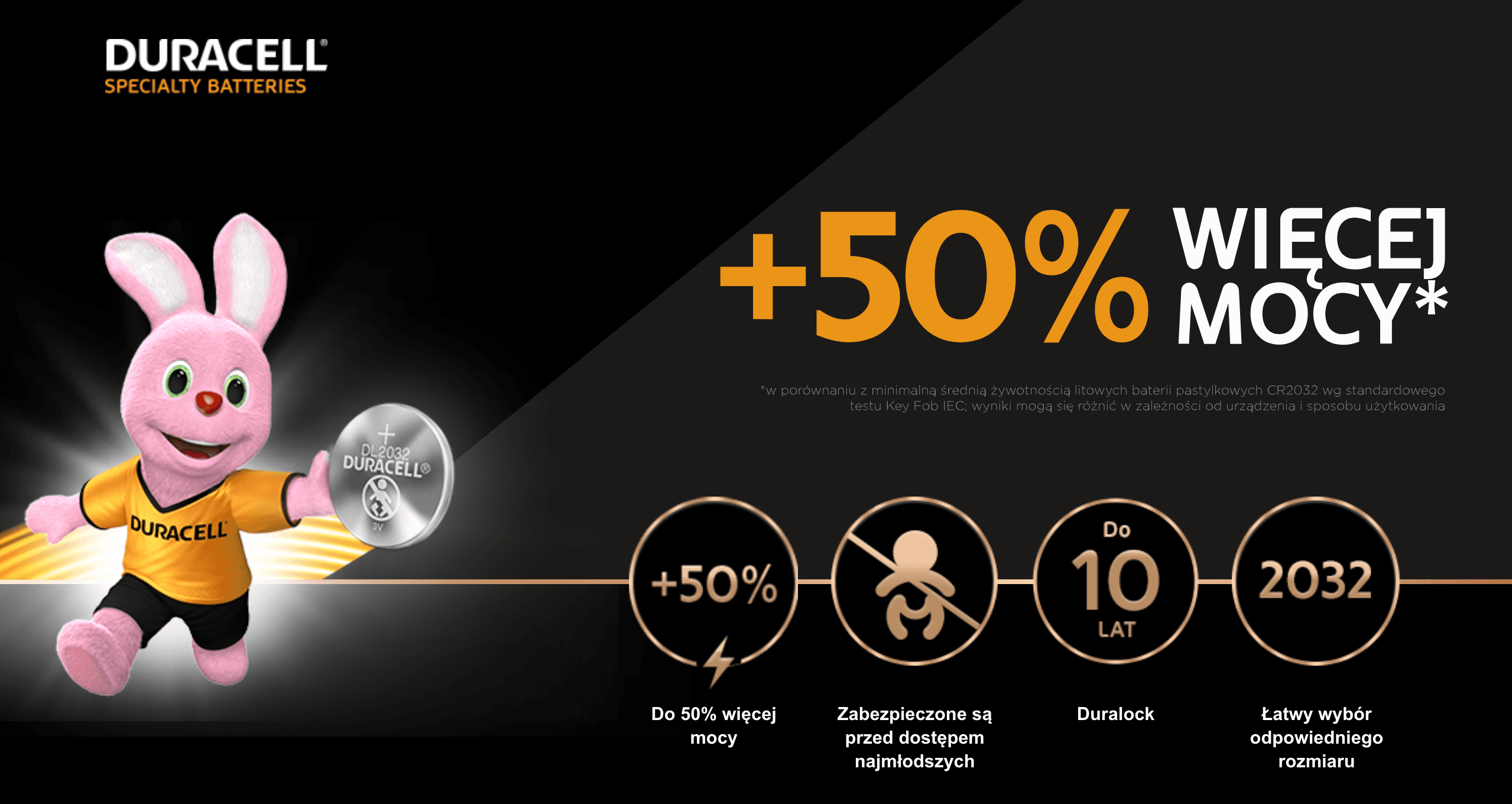 Litowe baterie pastylkowe Duracell 2032 - do 50% więcej mocy*.