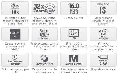 16-krotne zbliżenie optyczne opracowane przez firmę Canon pozwala zbliżyć się do odległego obiektu. Dzięki technologii ZoomPlus, która rozszerza zakres zbliżenia z zachowaniem wyższej jakości niż standardowe zbliżenie cyfrowe, możemy uzyskać nawet 32-krotne zbliżenie. Szerokokątny obiektyw 28 mm rejestruje imponujące krajobrazy i obejmie w kadrze wszystkie osoby podczas zdjęć grupowych.