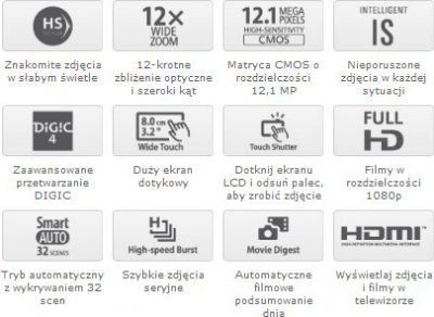 Obiektyw Canon umożliwia skorzystanie z 12-krotnego zbliżenia optycznego, a 28-milimetrowy obiektyw szerokokątny pozwala zmieścić więcej w kadrze i wykonywać doskonałe zdjęcia grupowe i krajobrazowe. Inteligentny system IS automatycznie dopasowuje optyczny stabilizator obrazu do jednego z 7 trybów aby zapobiec efektowi rozmycia i uzyskać ostre, szczegółowe zdjęcia i filmy.