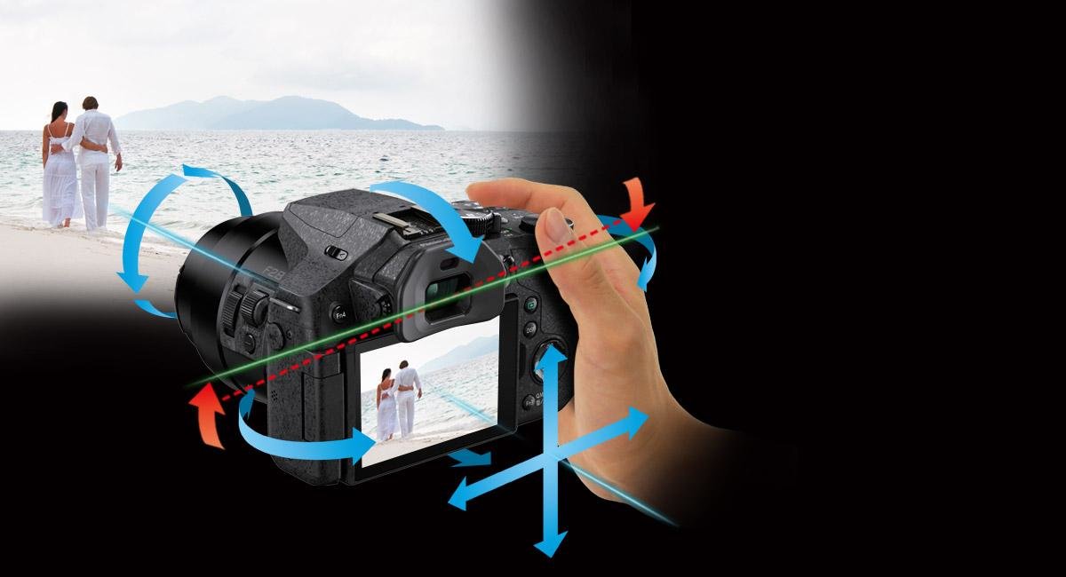 5-osiowy stabilizator optyczny HYBRID O.I.S.+ umożliwia nagrywanie wyraźnych filmów wideo bez rozmazań przy użyciu jednej ręki. Wykrywa i skuteczne niweluje 5 typów poruszenia aparatu – w poziomie, w pionie, oś obrotu, obrót w pionie i obrót w poziomie. Funkcja stabilizacji obrazu wykrywa poziomą płaszczyznę obrazu i zachowuje ją nawet w przypadku przechylenia aparatu. Pozwala to uzyskać stabilne nagrania nawet przy nagrywaniu pod kątem i bez podglądu.