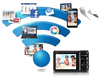 Łączność Wi-Fi Wbudowana funkcja łączności bezprzewodowej Wi-Fi umożliwia udostępnianie szczególnych chwil i ekscytujących przygód z biegu. Publikuj zdjęcia z serwisach Facebook™, Picasa™ czy Photobucket™ lub wysyłaj je w wiadomości e-mail bezpośrednio z aparatu. Możesz również załadować filmy na YouTube, a potem usiąść wygodnie i czekać na oklaski. WB850F umożliwia ładowanie zdjęć przy użyciu usług typu „chmura”, dzięki czemu nie musisz martwić się o utratę zdjęć z podróży lub o to, że z powodu przepełnionej pamięci karty przegapisz chwilę wartą sfotografowania. Z kolei funkcja TV Link obsługuje wyświetlanie zdjęć na ekranie telewizora bez użycia kabli. Możesz również zapisywać zdjęcia na komputerze jednym kliknięciem dzięki funkcji automatycznej kopii zapasowej. To takie proste! I już nie musisz szukać kabli.