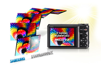 3-calowy wyświetlacz AMOLED VGA Nieważne, czy opalasz się właśnie na plaży, czy też zwiedzasz zabytki z samo południe, aparat WB850F będzie doskonałym rozwiązaniem. Wąski i lekki ekran AMOLED VGD 3" wyświetla ciemniejszą czerń i żywsze kolory niż ekrany TFT-LCD. Zdjęcia są wyraźne i żywsze pod każdym kątem i łatwiej je zobaczyć nawet przy ostrym słońcu z środku dnia.