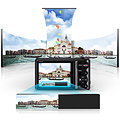Tryb panoramiczny na żywo Dzięki funkcji zdjęć panoramicznych na żywo uchwycisz każdy szczyt imponującego pasma górskiego lub wszystkie drapacze chmur z miejskim krajobrazie na wspaniałych zdjęciach z panoramą 180º. Przed zrobieniem zdjęcia możesz wyświetlić kadr na ekranie LCD. Wystarczy przytrzymać spust migawki, przesunąć aparat po kadrze i już można zobaczyć, co znajdzie się na zdjęciu.