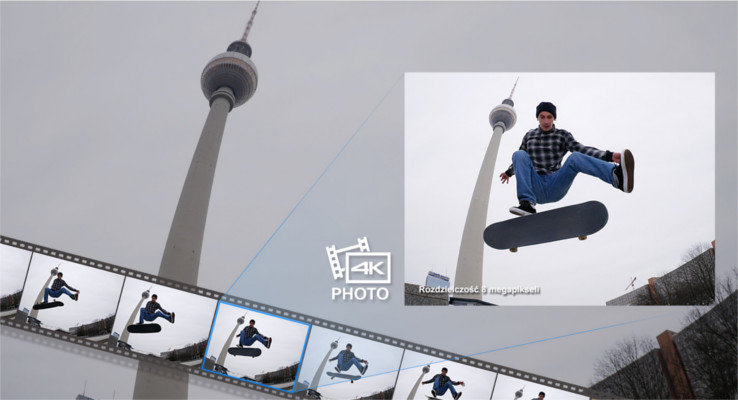 Nie przeocz idealnej chwili Funkcja 4K PHOTO pozwala uchwycić obraz w idealnym momencie dzięki możliwości wybrania klatki z sekwencji wideo (rejestrowane z szybkością 30 kl./s) i zapisania jej jako pojedyncze zdjęcie wysokiej rozdzielczości. Po prostu zrób zdjęcie, wybierz i zapisz, by utrwalić niezapomniane chwile. |