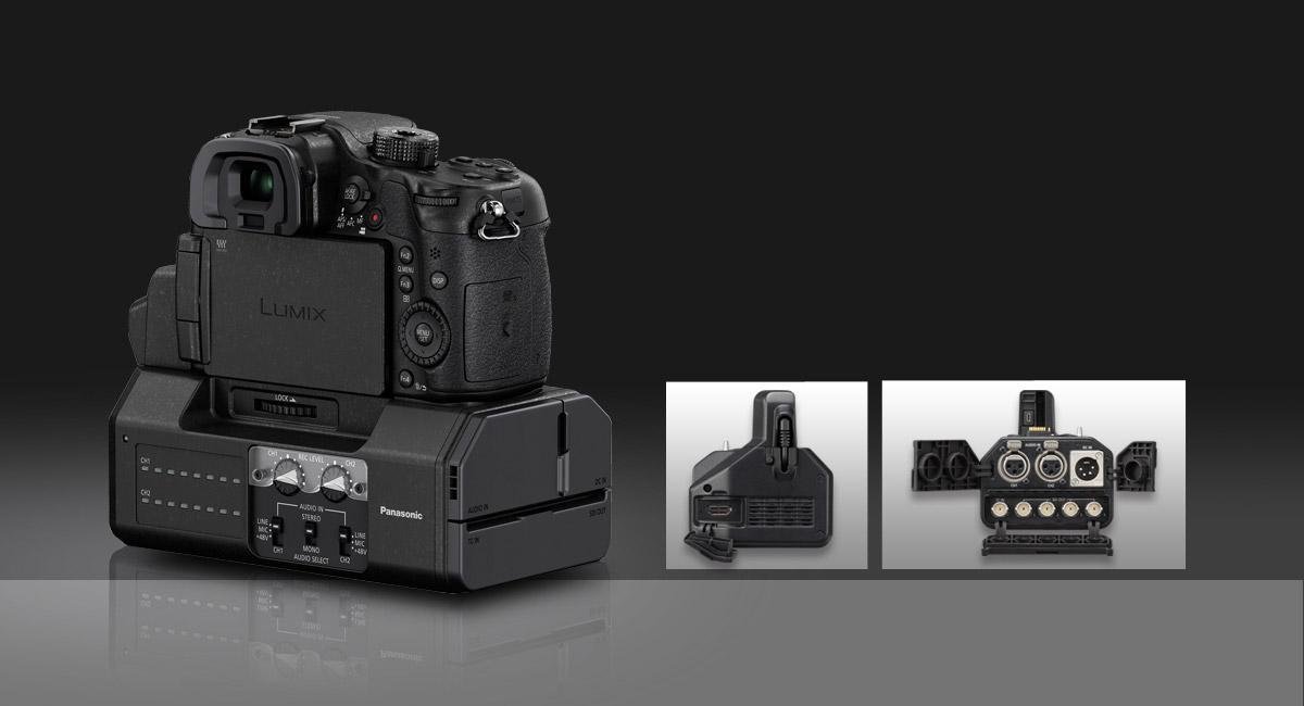 Moduł interfejsu (DMW-YAGH) oferowany jest wyłącznie w przypadku zastosowań profesjonalnych / przemysłowych. Pozwala on zwiększyć parametry transmisji wideo. Obsługuje cztery równoległe wyjścia w standardzie Full HD (4:2:2 / 10 bitów) oraz 4K (4:2:2 / 10 bitów), w obu przypadkach z kodami czasowymi*. 2-kanałowe złącza wejściowe XLR umożliwiają podłączenie mikrofonu liniowego lub kondensacyjnego. W przypadku mikrofonu można osobno określać głośność dla lewego i prawego kanału. Zasilanie urządzenia: prąd stały o napięciu 12 V. * W przypadku wyjścia 4:2:2 / 10 bitów jednoczesne nagrywanie filmu na karcie pamięci SDXC/SDHC znajdującej się w aparacie nie jest możliwe.