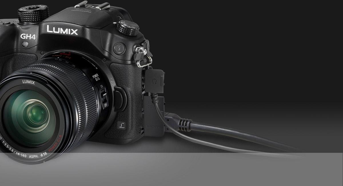 Transmisja w czasie rzeczywistym przez wyjście HDMI Model DMC-GH4 może wysyłać obraz w czasie rzeczywistym (4:2:2 / 8 bitów lub 4:2:2 / 10 bitów) do monitora zewnętrznego przez opcjonalny kabel microHDMI*. Dzięki temu aparat można wykorzystać do profesjonalnego nagrywania filmów, wymagającego nieustannego monitorowania rejestrowanego obrazu, przy czym na ekranie lub monitorze oglądać można sam obraz lub dodatkowo menu ustawień (opcje te można zmieniać oddzielnie dla każdego ekranu). W przypadku wyjścia 4:2:2 / 10 bitów jednoczesne nagrywanie filmu na karcie pamięci SDXC/SDHC znajdującej się w aparacie nie jest możliwe. W przypadku wyjścia 4:2:2 / 8 bitów film jest nagrywany w formacie 4:2:0 / 8 bitów na karcie pamięci SDXC/SDHC znajdującej się w aparacie.