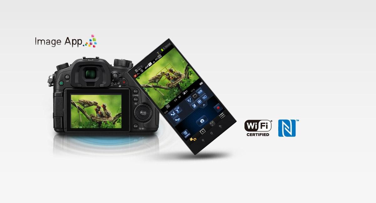 Wi-Fi® z technologią NFC Model DMC-GH4 zawiera funkcje komunikacji Wi-Fi® (IEEE 802.11 b/g/n) z obsługą technologii NFC (Near Field Communication). Aplikacja „Panasonic Image App” umożliwia zdalne rejestrowanie zdjęć i filmów za pomocą smartfona lub tabletu. Po wykonaniu zdjęcia można do niego łatwo dodać informacje o położeniu geograficznym. Jeśli smartfon lub tablet nie obsługuje technologii NFC, aparat wyświetla na ekranie specjalny kod QR. Wystarczy zeskanować ten kod, aby nawiązać połączenie między urządzeniami.