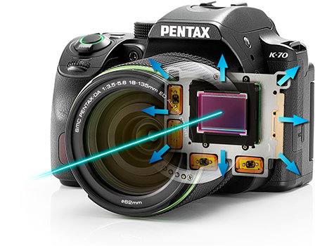 Efektywna stabiliazacja nawet w trudnych warunkach PENTAX K-70 wyposażono w nowoczeny mechanizm stabilizacji obrazu SR (Shake Reduction) o skuteczności 4.5 kroków wartości ekspozycji, który współpracuje ze wszystkimi wymiennymi obiektywami PENTAX. System redukcji wstrząsów efektywnie minimalizuje poruszenia aparatu nawet podczas korzystania z teleobiektywu, robienia zdjęć w przy słabym oświetleniu lub fotografowania krajobrazów o zachodzie słońca. Podczas wykonywania zdjęć panoramicznych aparat automatycznie wykrywa kierunek ruchu i za pomocą żyroskopu efektywnie minimalizuje drgania. |