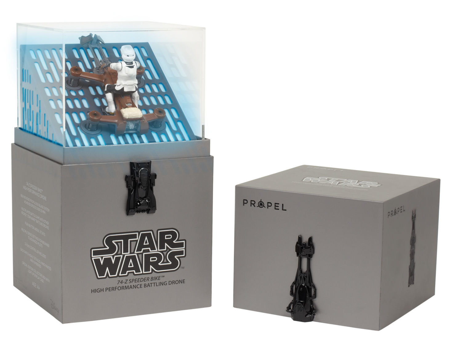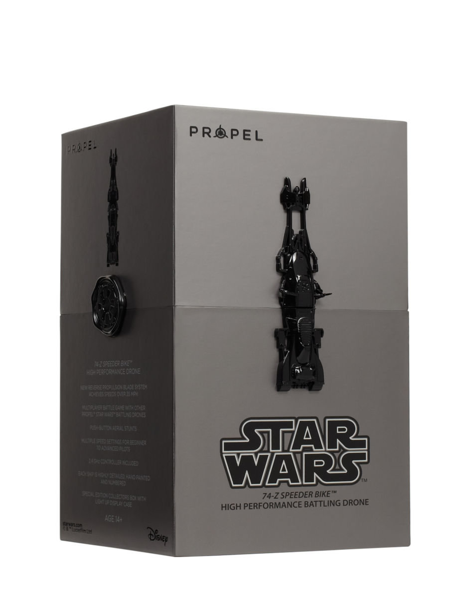 Indywidualnie numerowana edycja kolekcjonerska dronów Propel została stworzona z myślą o fanach Gwiezdnych Wojen. Wykonane z niezwykłą dbałością o najmniejsze szczegóły, ręcznie malowane drony zostały umieszczone w gablocie z podświetlaną platformą, a następnie zamknięte w pudełku opatrzonym pieczęcią woskową z emblematem oraz trójwymiarowym modelem drona. Wystarczy podnieść górną cześć pudełka, aby platforma się podświetliła, a zintegrowane z nią głośniki uruchomiły znajomą melodie z najpopularniejszej Sagi. |