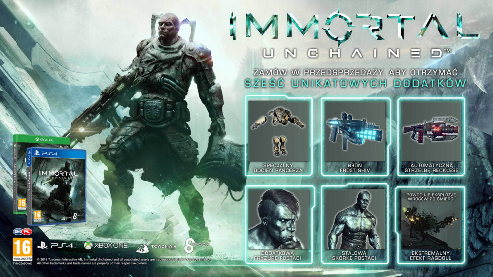 Immortal: Unchained łączy taktyczną walkę i strzelaninę trzecioosobową z mechanikami RPG, tworząc niepowtarzalne i innowacyjne wrażenia, zainspirowane popularnym gatunkiem hardkorowego RPG akcji. Uwolniony przez Strażnika, otrzymujesz zlecenie powstrzymania końca świata. Użyj zróżnicowanego arsenału broni wręcz i dystansowej, aby wziąć udział w brutalnych, taktycznych starciach, odkrywając jednocześnie mroczne, połączone światy science-fiction i poszukując prawdy oraz odkupienia. |
