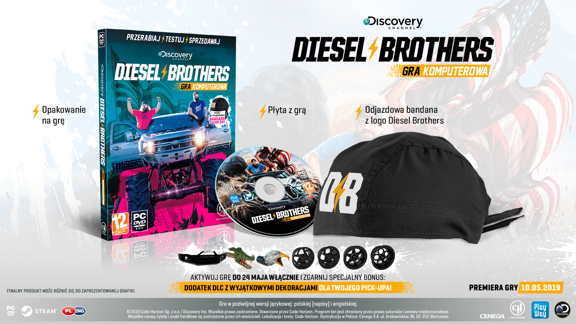 Miło nam poinformować, że premierowe wydanie gry w pudełkach poza płytą z grą będzie zawierać bandanę z logo Diesel Brothers! Dodatkowo po aktywacji gry na platformie Steam do 24 maja włącznie, posiadacze tego tytułu uzyskają komplet dodatków kosmetycznych w grze, które wyróżnią pojazdy na tle konkurencji!