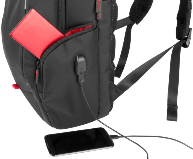 Głównym wyróżnikiem plecaka Genesis Pallad 400 jest wygodny zewnętrzny port USB umieszczony na bocznej kieszeni. Po podpięciu do niego powerbanka, możemy wygodnie i bezproblemowo ładować urządzenia mobilne w trakcie podróży!