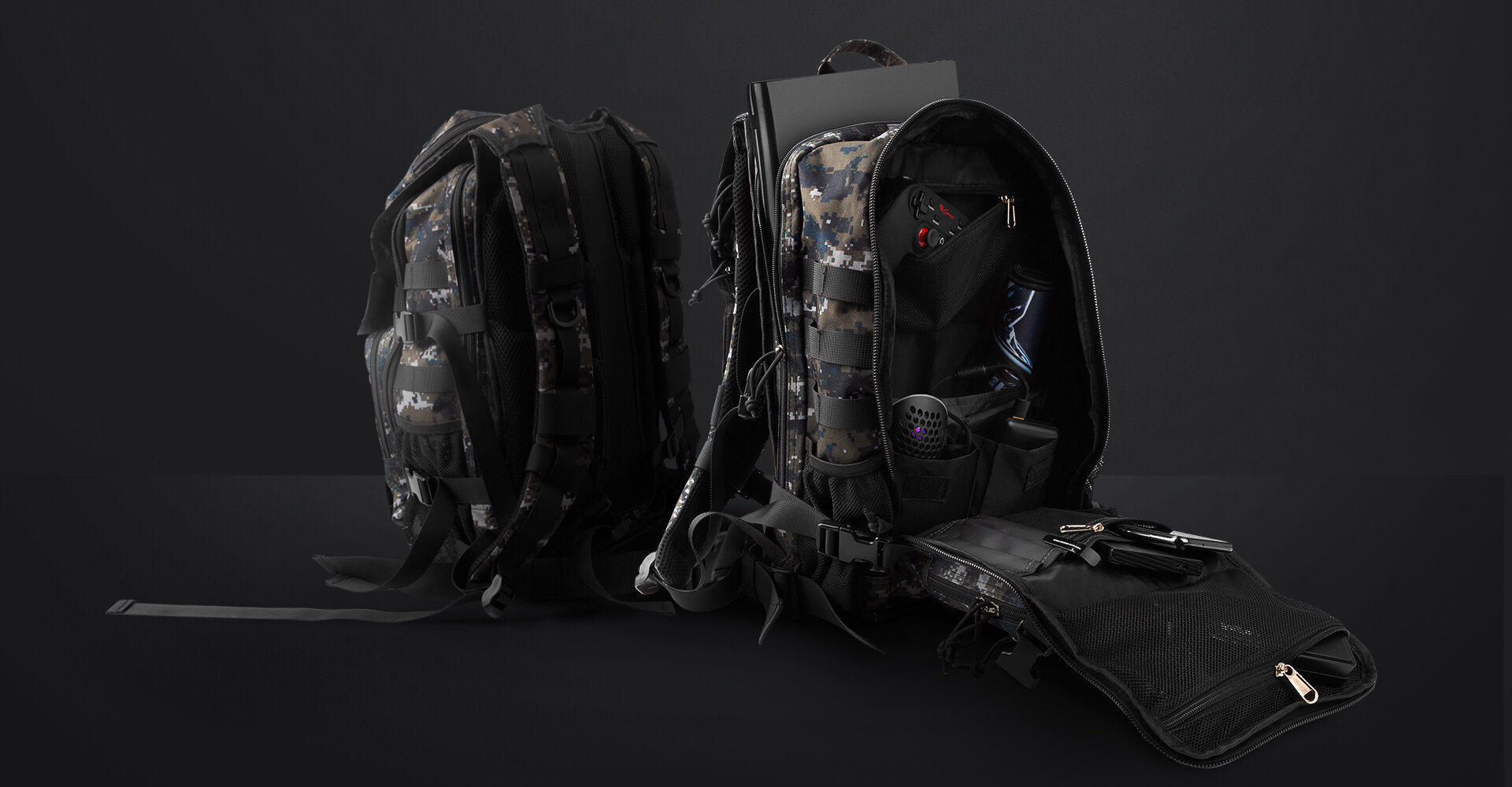 Plecak jest niezwykle pakowny i funkcjonalny. Posiada dwie komory główne, które pomieszczą cały arsenał gamera. Jedna z nich posiada liczne dedykowane kieszenie: na myszkę, powerbank i inne peryferia, a drugą – przeznaczoną na laptopa 15,6” wzbogacono dodatkowo o przegrodę na tablet.