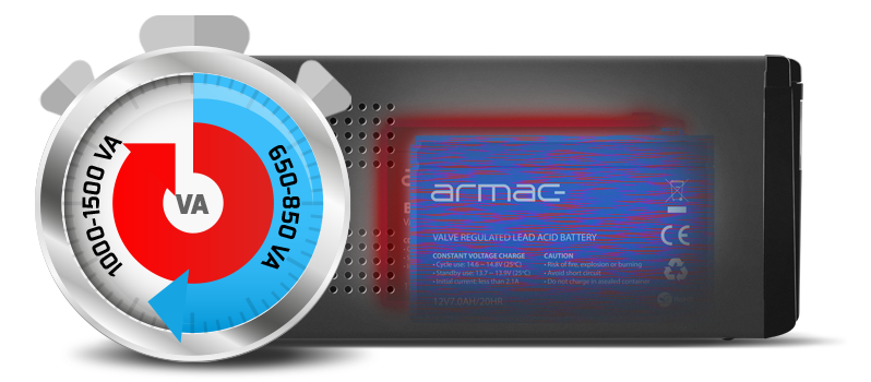 Wielu użytkowników stawia urządzeniom zasilania awaryjnego zróżnicowane wymagania odnośnie pojemości baterii oraz zakresu ich mocy. Dlatego Armac w ofercie UPS-ów posiada dwa warianty ilości baterii, niezależnie od modelu i serii. W standardowych modelach 650 VA - 850 VA Home i Office została zastosowana 1 bateria, a w modelach 1000 VA - 1500 VA umieszczono 2 baterie co przekłada się na zauważalny dłuższy czas podtrzymania obciążeń, w zakresie od 26% do nawet 37% (w zależności od zastosowanego obciążenia i mocy UPS-a). Dzięki wprowadzeniu dodatkowego wariantu UPS-ów z większą ilością baterii w przypadku zaniku zasilania, nie musisz się martwić (w stosunku do użytkowników posiadających UPS-y z mniejszymi mocami) o kończący się czas podtrzymania podczas trybu bateryjnego. Bez pośpiechu możesz dokończyć słuchanie ulubionego utworu, bezpiecznie i spokojnie zapisać pracę lub ważny projekt na komputerze lub laptopie, zgrać dane z płyty CD/DVD lub NAS-a, czy dokończyć rozmowę telefoniczną lub emocjonującą rozgrywkę. Dłuższy czas, większa swoboda oraz komfort pracy podczas korzystania ze sprzętu w trybie bateryjnym UPS-a jest w zasięgu ręki - wystarczy wybór systemu zasilania awaryjnego z większą mocą.