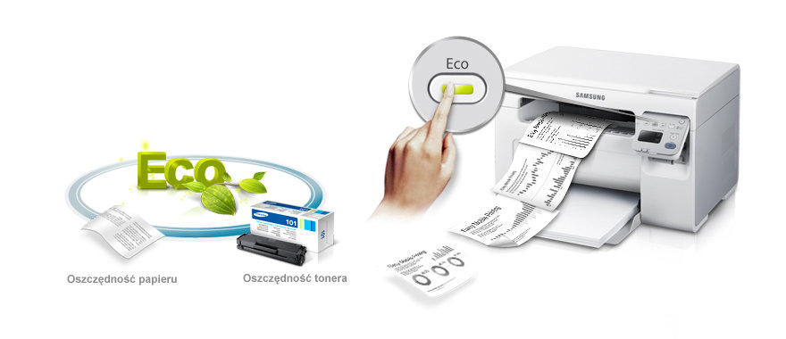 Optymalne drukowanie za jednym naciśnięciem przycisku Eco. Możesz zmniejszyć wydatki na drukowanie, szybko przełączając na tryb Eco, który oszczędza toner, papier i energię. Nie musisz już marnować czasu na zmianę ustawień ani modyfikację drukowanych plików. Dzięki tej funkcji możesz uzyskać najbardziej ekonomiczne rezultaty za jednym naciśnięciem przycisku.