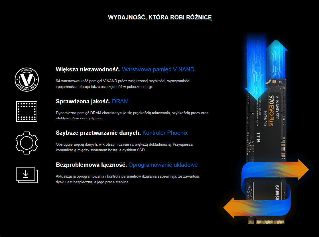 Chciałbyś, by Twój PC dał z siebie wszystko? Dysk 970 EVO Plus osiąga sekwencyjną prędkość odczytu/zapisu wynoszącą odpowiednio nawet do 3500/3300 MB/s*, a zatem aż o 53% wyższą niż w przypadku 970 EVO**. Najnowsze rozwiązanie V-NAND – zapewniające doskonalszą wydajność NAND i lepszą energooszczędność – wraz ze zoptymalizowanym oprogramowaniem sprzętowym, sprawdzonym kontrolerem Phoenix i inteligentnym TurboWrite.