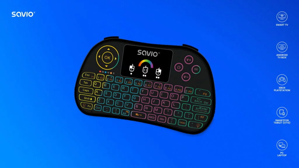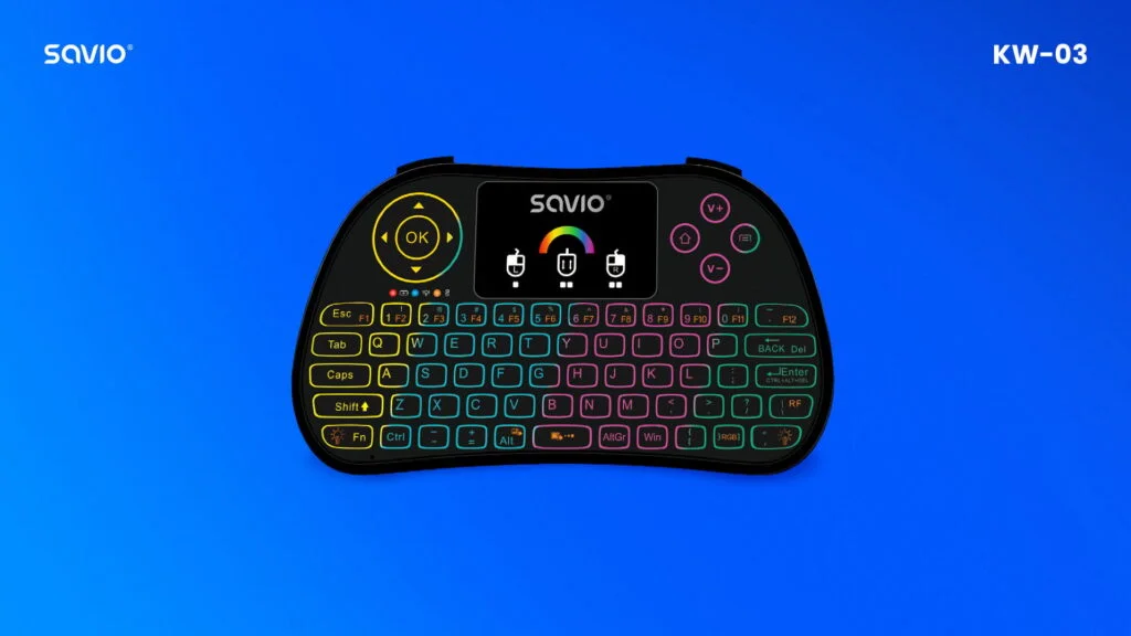 Klawiatura Podświetlana RGB SAVIO KW-03 to wielofunkcyjne, kompaktowe urządzenie, łączące w sobie cechy pełnowymiarowej klawiatury QWERTY oraz panelu dotykowego (touchpad). Dzięki klawiaturze KW-03 możemy w szybki i wygodny sposób przeglądać strony internetowe lub korzystać z zainstalowanych aplikacji.
