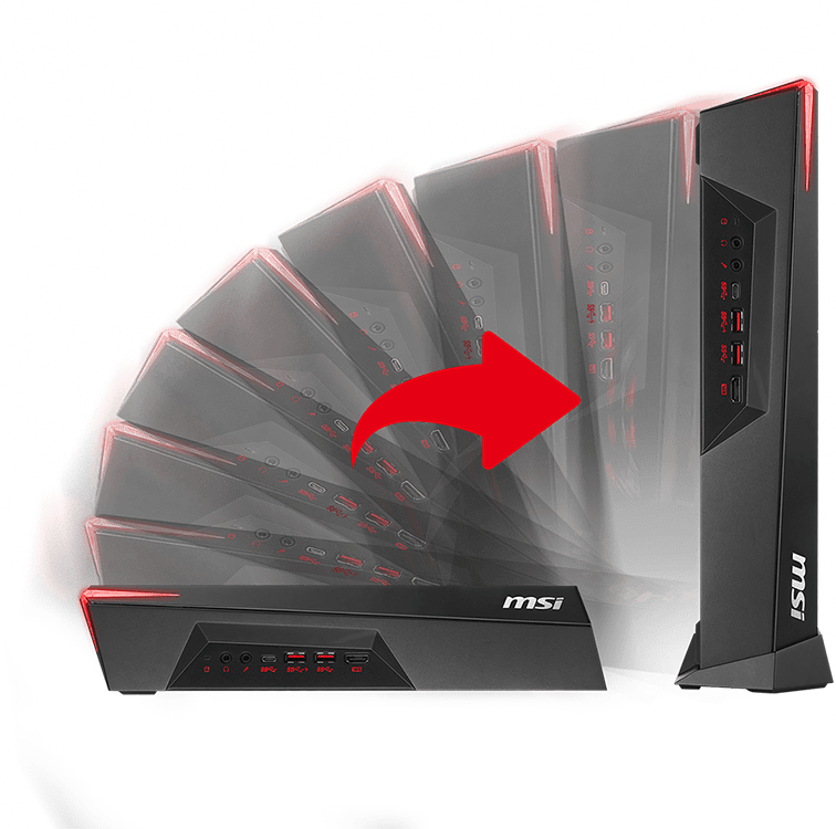 Możesz swobodnie wybrać, jak korzystać z komputera Trident 3. Do zestawu dołączono specjalną podstawkę, która umożliwia postawienie Tridenta 3 w pozycji pionowej. Dzięki temu MSI Trident 3 zawsze dopasuje się do Twoich gamingowych potrzeb