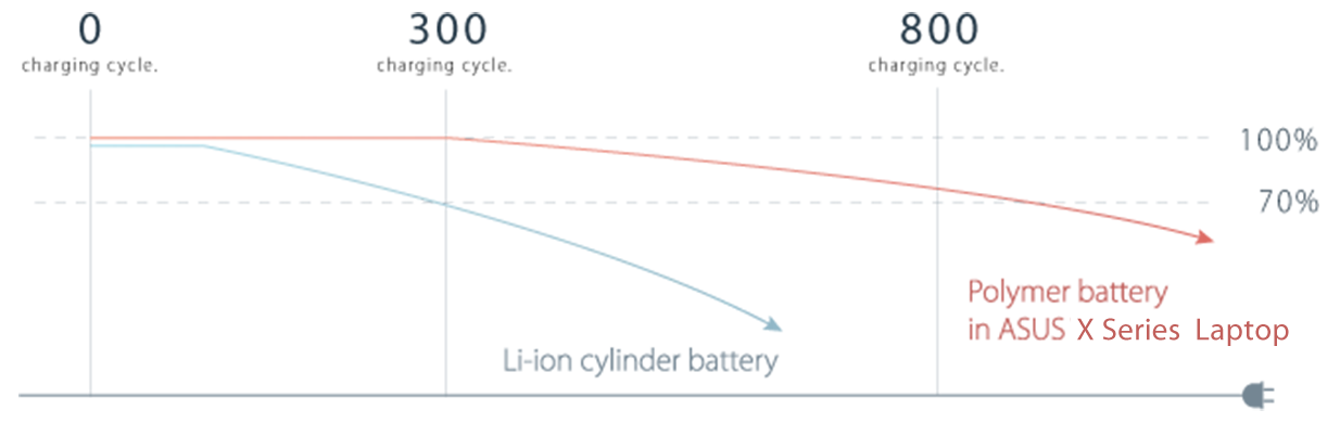 Laptopy ASUS z serii X zostały wyposażone w baterię litowo-polimerową, która może przetrwać nawet 800 cykli ładowania - to 2,5 razy więcej niż standardowa cylindryczna bateria litowo-jonowa. A ponadto, bateria litowo-polimerowa zachowuje do 80% pierwotnej pojemności ładowania nawet po setkach cykli ładowania. Dlatego nie musisz martwić się spadającą wydajnością baterii. Dzięki sprytnemu połączeniu optymalizacji sprzętu i oprogramowania, bateria spełnia najwyższe wymogi standardów bezpieczeństwa baterii i zapewnia optymalną wydajność ładowania, która przedłuża jej żywotność.