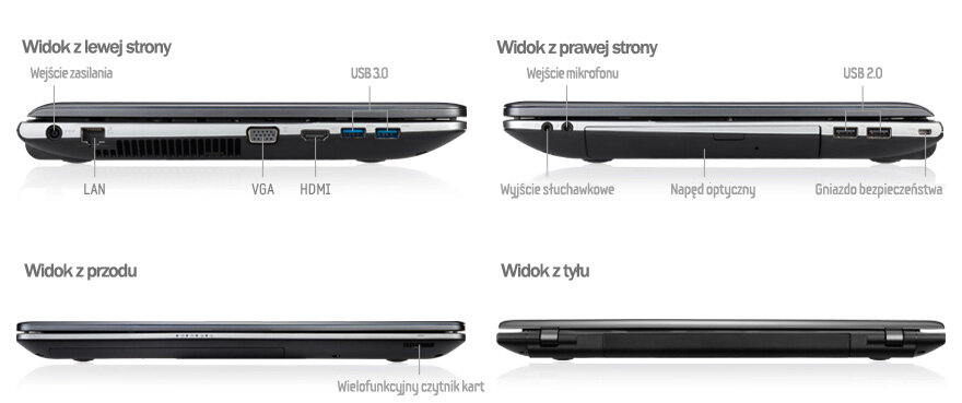 Szybko przesyłaj dane między notebookiem a zewnętrznymi urządzeniami z prędkością nawet 5 Gb/s przez port USB 3.0, dziesięciokrotnie szybszy niż standardowy. Ponadto porty HDMI i VGA umożliwiają łatwe podłączenie nowoczesnego telewizora lub dużego monitora, dzięki czemu będziesz oglądać filmy i zdjęcia na znacznie większym ekranie.
