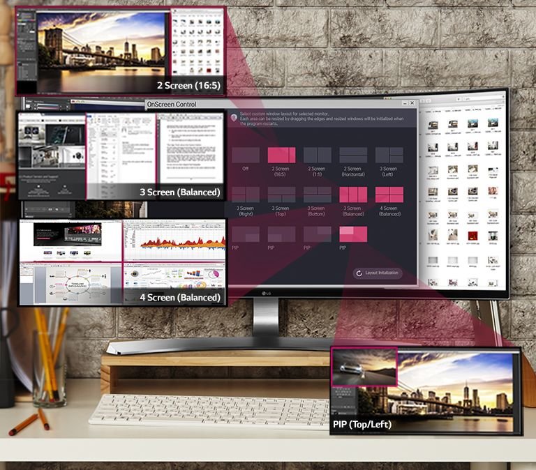 Funkcja Screen Split to komfort pracy wielozadaniowej. Pozwala swobodnie dostosować podział ekranu do Twoich potrzeb. Zaawansowane opcje obejmują aż 14 ustawień, w tym 4 różne konfiguracje trybu „obraz w obrazie (PIP)”. Dzięki trybowi PIP można pracować na głównym ekranie oraz oglądać film w małym oknie wyświetlanym na tle podstawowego obszaru.