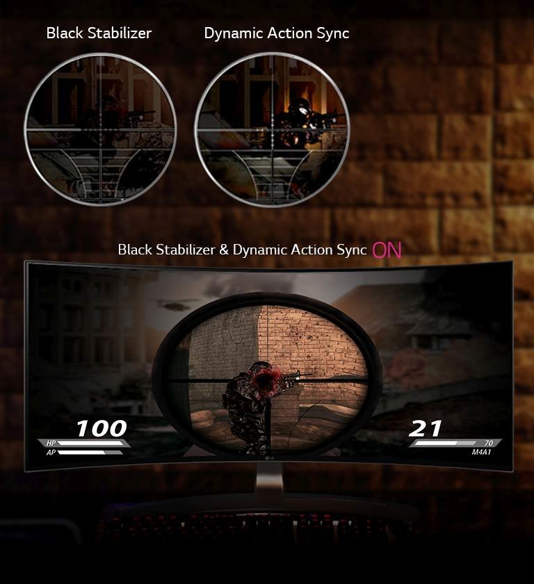 Black Stabilizer zapewnia pełną widoczność, nawet w najciemniejszych lokacjach. Ciemne obszary zostają rozjaśnione tak, że bez trudu odnajdziesz czyhających wrogów. Natomiast sceny zbyt jasne (np. granat błyskowy), monitor częściowo wygasi. Z kolei funkcja Dynamic Action Sync dzięki skróconemu czasowi opóźnienia umożliwia szybsze atakowanie wrogów.