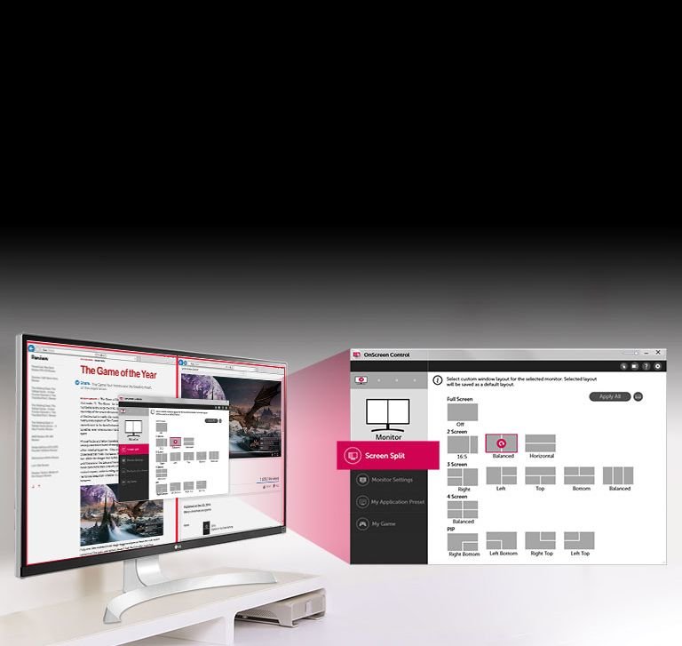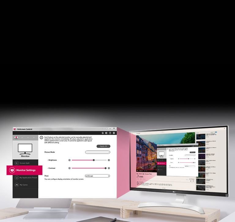 Każdy krok instalacji i regulacji przebiega łatwo i bezproblemowo. W programie OnScreen Control S/W (2.0) możesz regulować wszystkie ustawienia monitora zaledwie kilkoma kliknięciami. Poszukaj „OnScreen Control” w witrynie LG.com