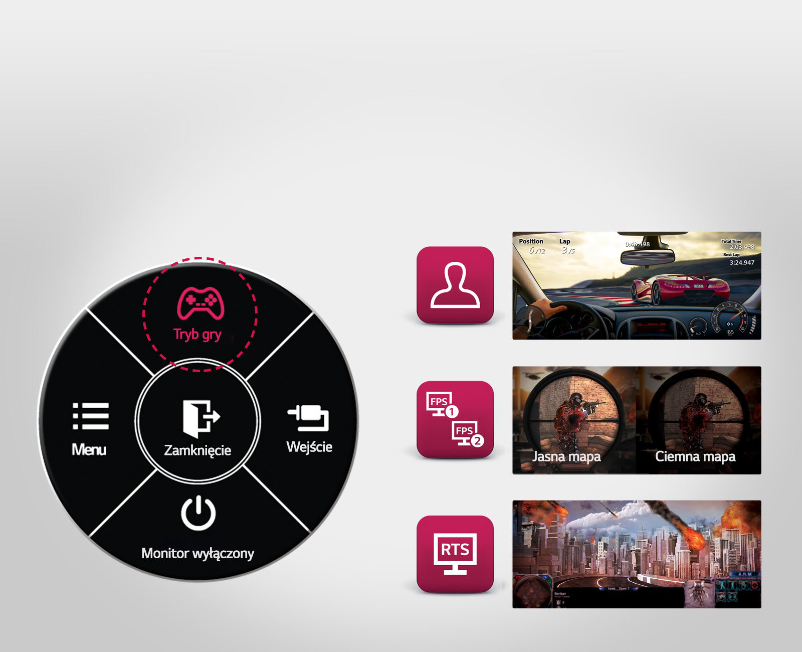 | Spersonalizuj swoje środowisko gry Dostosuj środowisko w zależności od gatunku gry. Możliwość wyboru optymalnych ustawień dla każdego gatunku gry to prawdziwa wygoda. Konkretne tryby obrazu dla gier są zapisywane w Quick Circle! |
