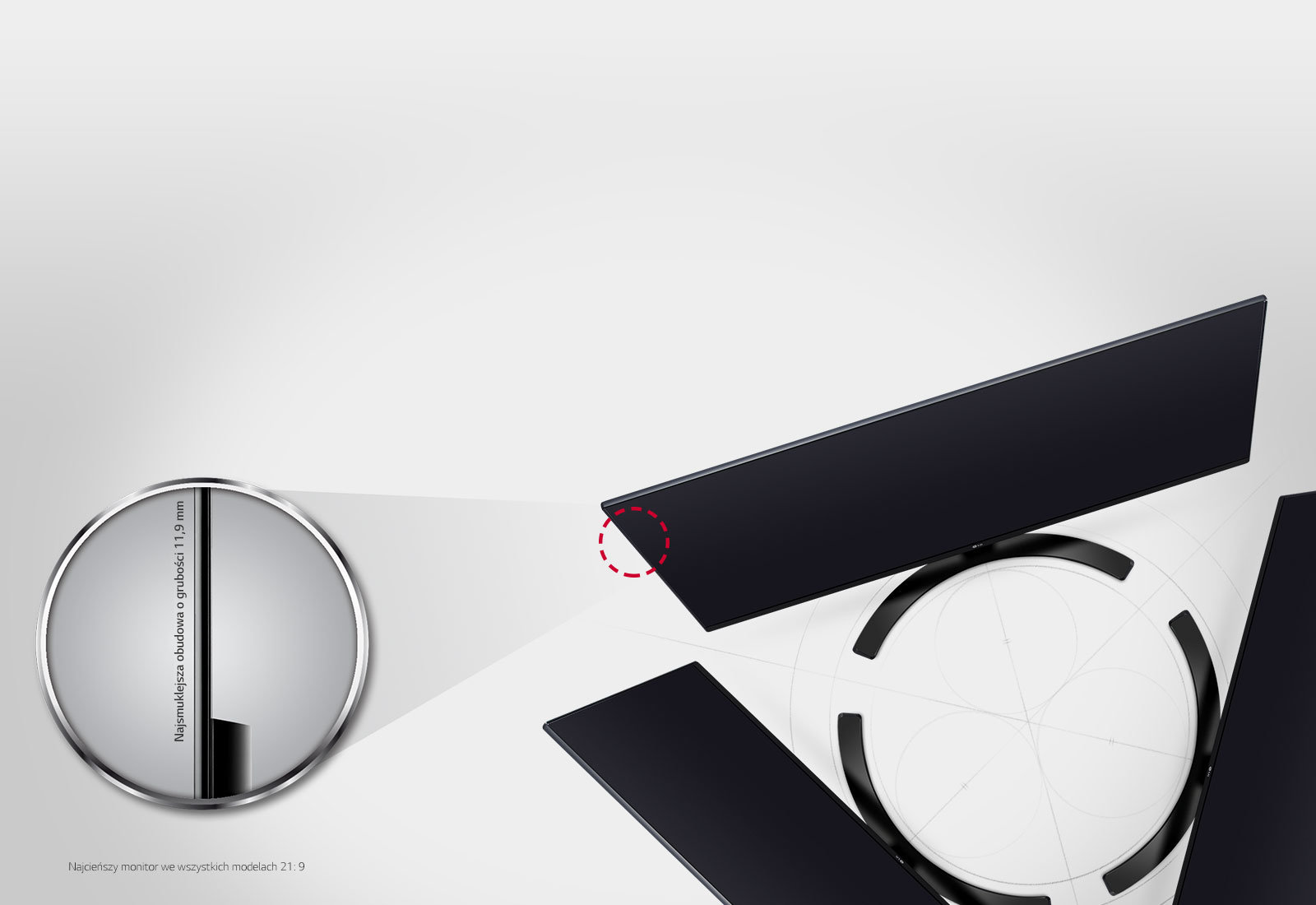 | Najsmuklejsza obudowa z nutą piękna ArcLine W połączeniu z najcieńszym monitorem o grubości 11,9 mm tworzy kombinację płynności i solidności w jednej zakrzywionej strukturze. Piękno ArcLine zapewnia komfort profesjonalistom, a podstawa zyskuje jeszcze większą stabilność. *Najcieńszy monitor ze wszystkich modeli LG o proporcjach 21:9. |