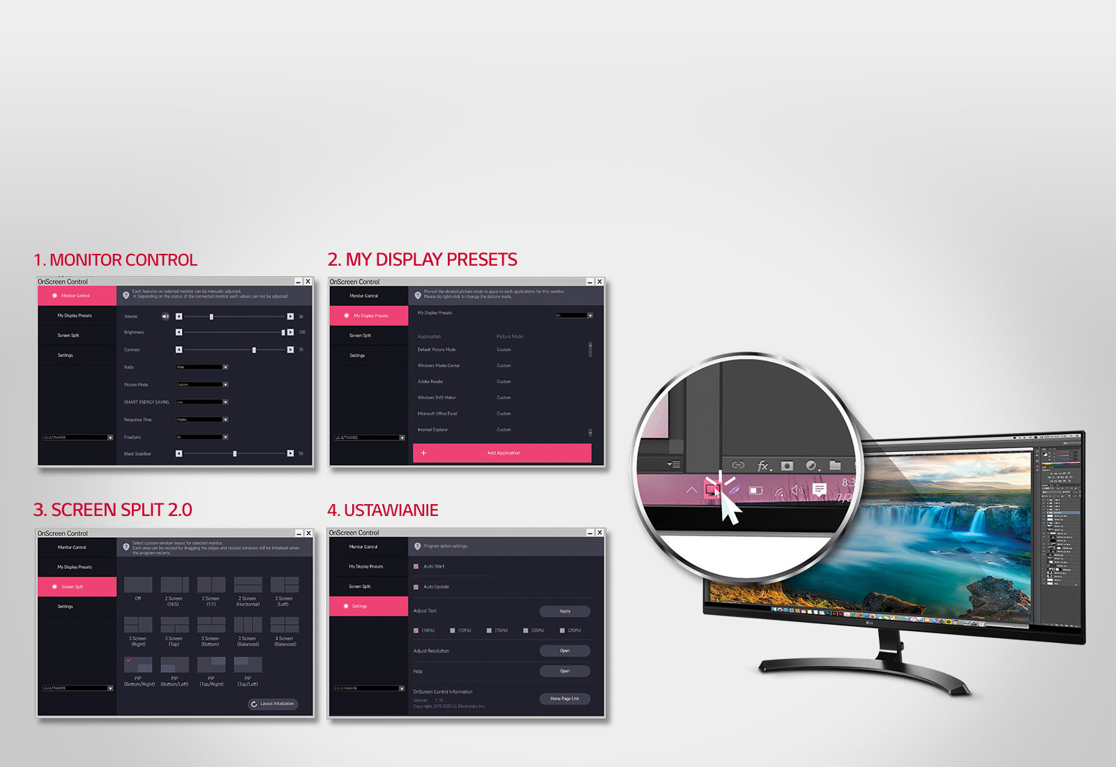 | Funkcji On Screen Funkcja On Screen Control umożliwia regulowanie ustawień ekranu i łatwe dostosowywanie przestrzeni roboczej do własnych potrzeb za pomocą zaledwie kilku kliknięć myszy. |